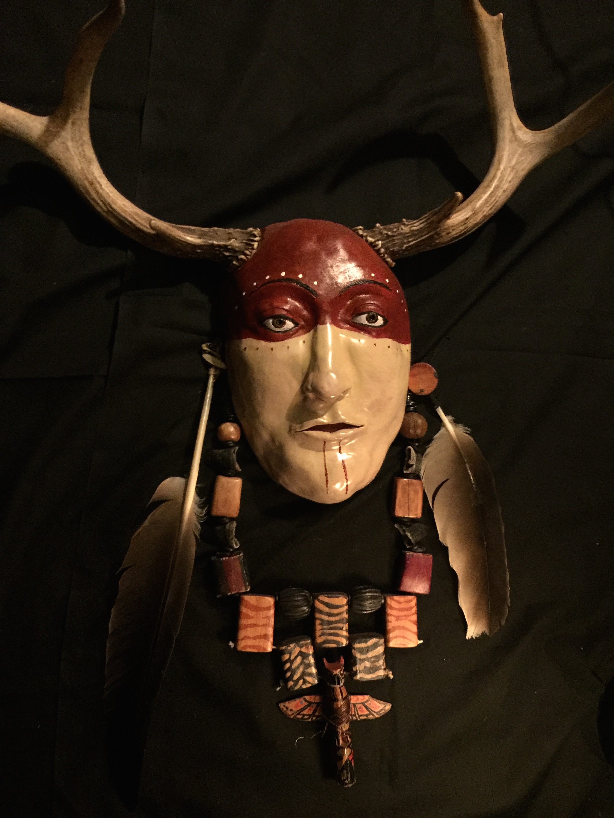 “Like other Maya gods, Chaac is both one and manifold. Four Chaacs are based in the cardinal directions and wear the directional colors. In 16th-century Yucatán, the directional Chaac of the east was called Chac Xib Chaac ‘Red Man Chaac’,”…Here is the final outcome of Red Man Chaac with antlers, and adorned with one of my necklaces.