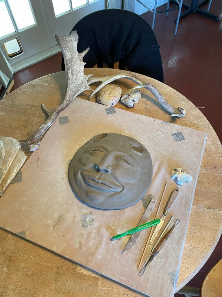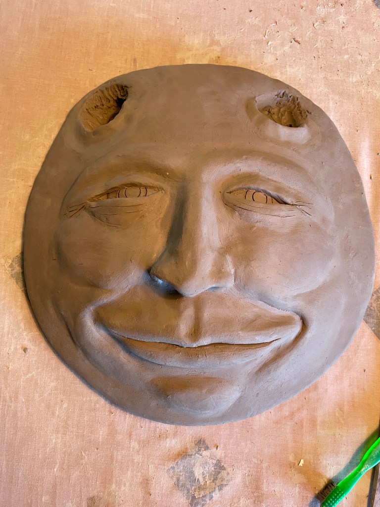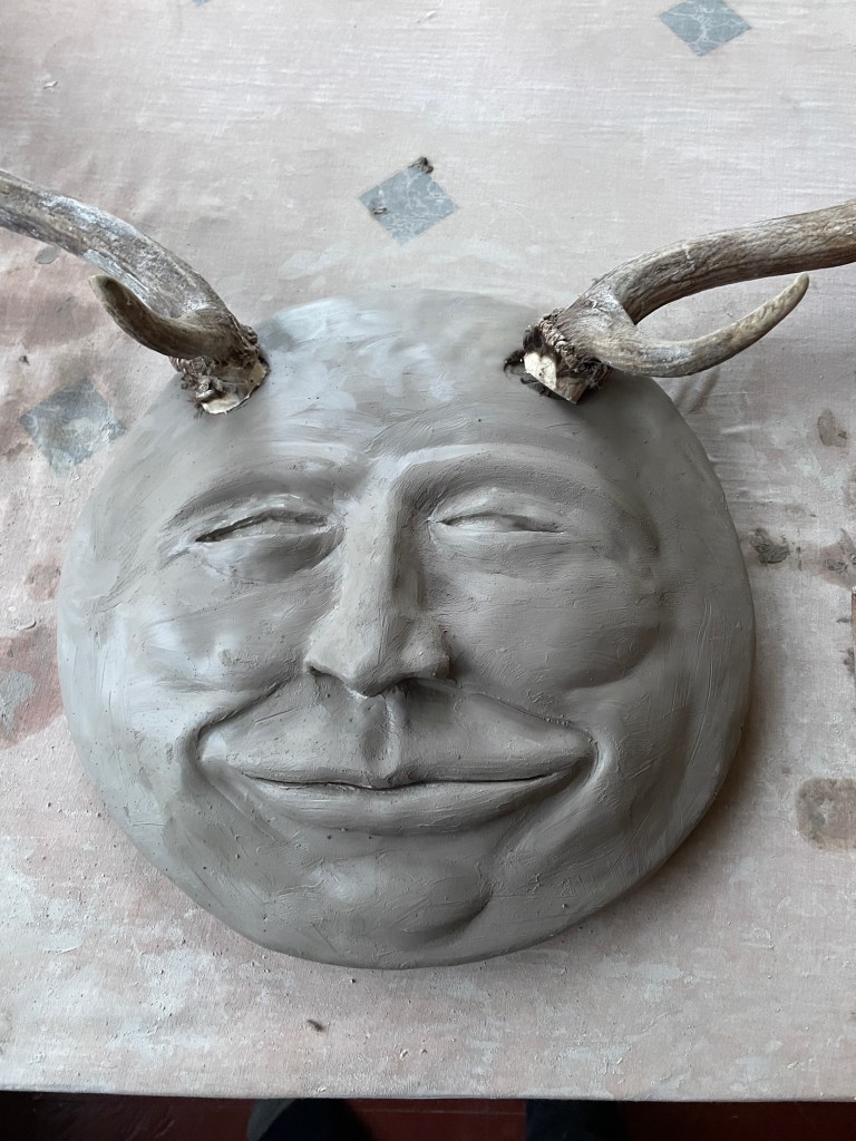 As always, I approach firing with trepidation as I’ve suffered one kiln disaster and would prefer not to repeat the experience. My friend John at “You Paint I Fire” has fired all my masks successfully, and Full Buck Moon was delivered intact and in one piece – with a great sigh of relief. Without scribbling about this any further, have a look at the pictures as I feel they give a fairly complete visual of the process.