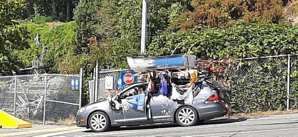 The weird:We (Mayne Island & Shavasana Gallery)had a visit this summer by a mystical wanderer, named Joseph, who travelled around in a beat-up grey car festooned with graffiti, assorted fabrics, branches & “found items”. He arrived at my place bearded & barefoot like a latter day Sadhu, and spoke in an almost imperceptible whisper (until I saw him chatting freely on his iPad Mini). I was OK with his presence, but others were not as welcoming and there was a sense that he was encouraged to “move on”…the final sightings of Joseph were at the Ferry Terminus (with someones’ boat on his roof) and then in Downtown Vancouver on Davie Street (pictured); The Surprising: recently a friend came into Shavasana and asked me if I knew that a fairly well-known island artist – Ian McLeod – had painted my image on a painting accompanied by 5 other Mayne Islanders – I hadn’t, so was surprised and delighted to see my stylized cartoonish red-head appear mid-right on the painting with Mike Nadeau, Al Sharma, Rudy Dearden & two other mystery islanders; The Funny: Despite everything & everybody, my sense of humour is intact, and for this I’m extremely grateful (not everybody is) I saw these two headlines recently – almost side by side – on my Guardian news App: “Earth’s Vital Signs show Humanity’s Future in Balance, say Climate Experts” (with possibility of Societal Collapse) next to, “No Matter How Hard he Tries, my Boyfriend Can’t Find my G-Spot”…please help me…I can’t decide which one to worry about more – but I do hope the boyfriend finds her G-Spot before societal collapse…that would be tragic🤣