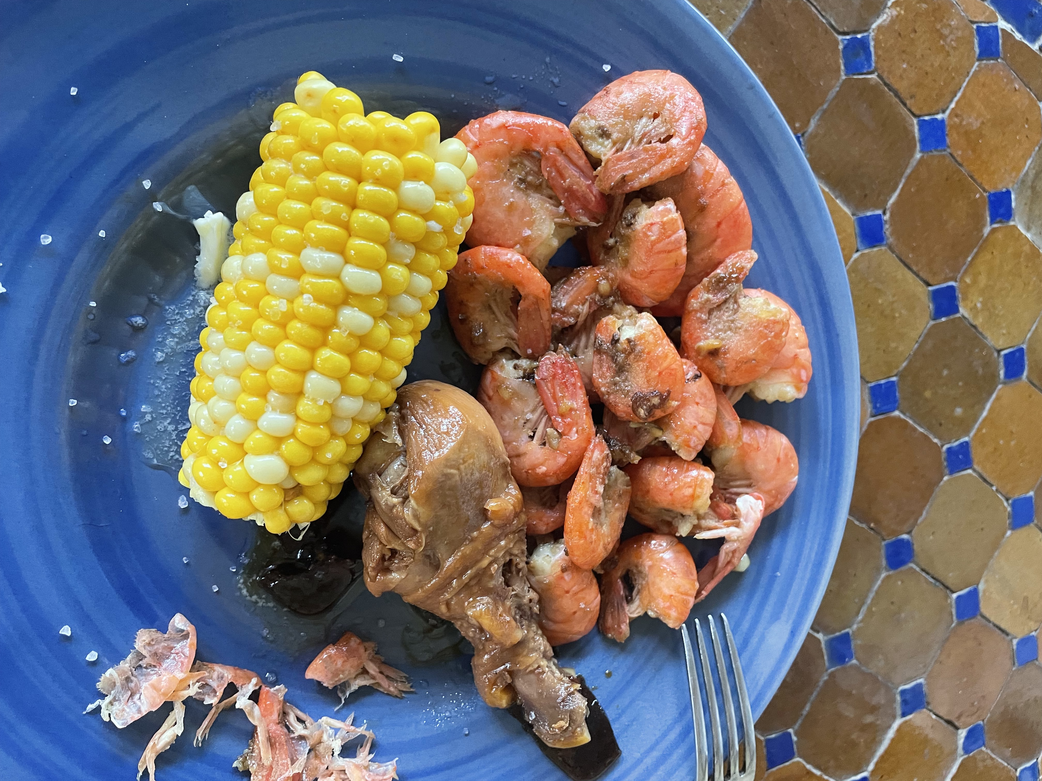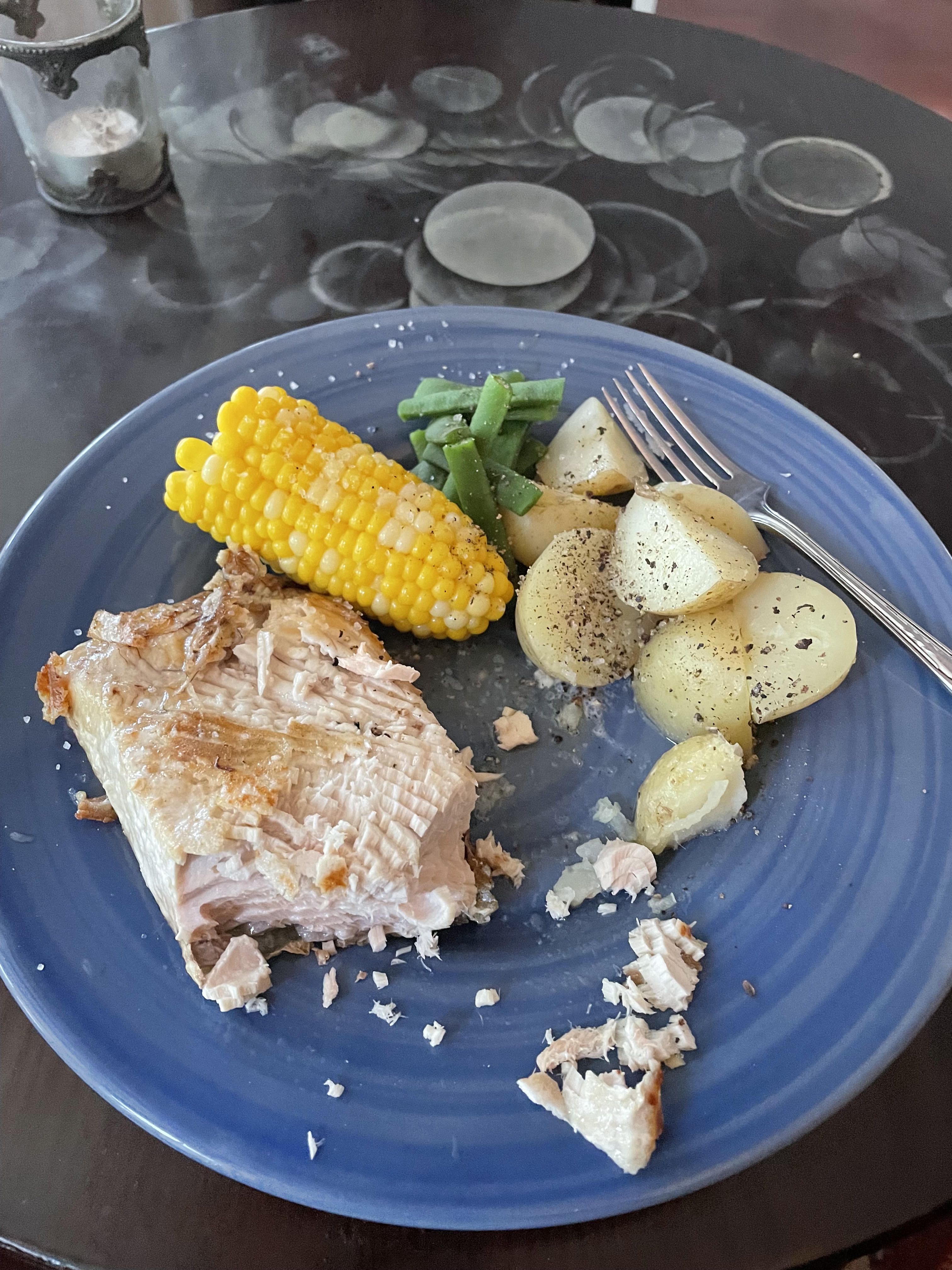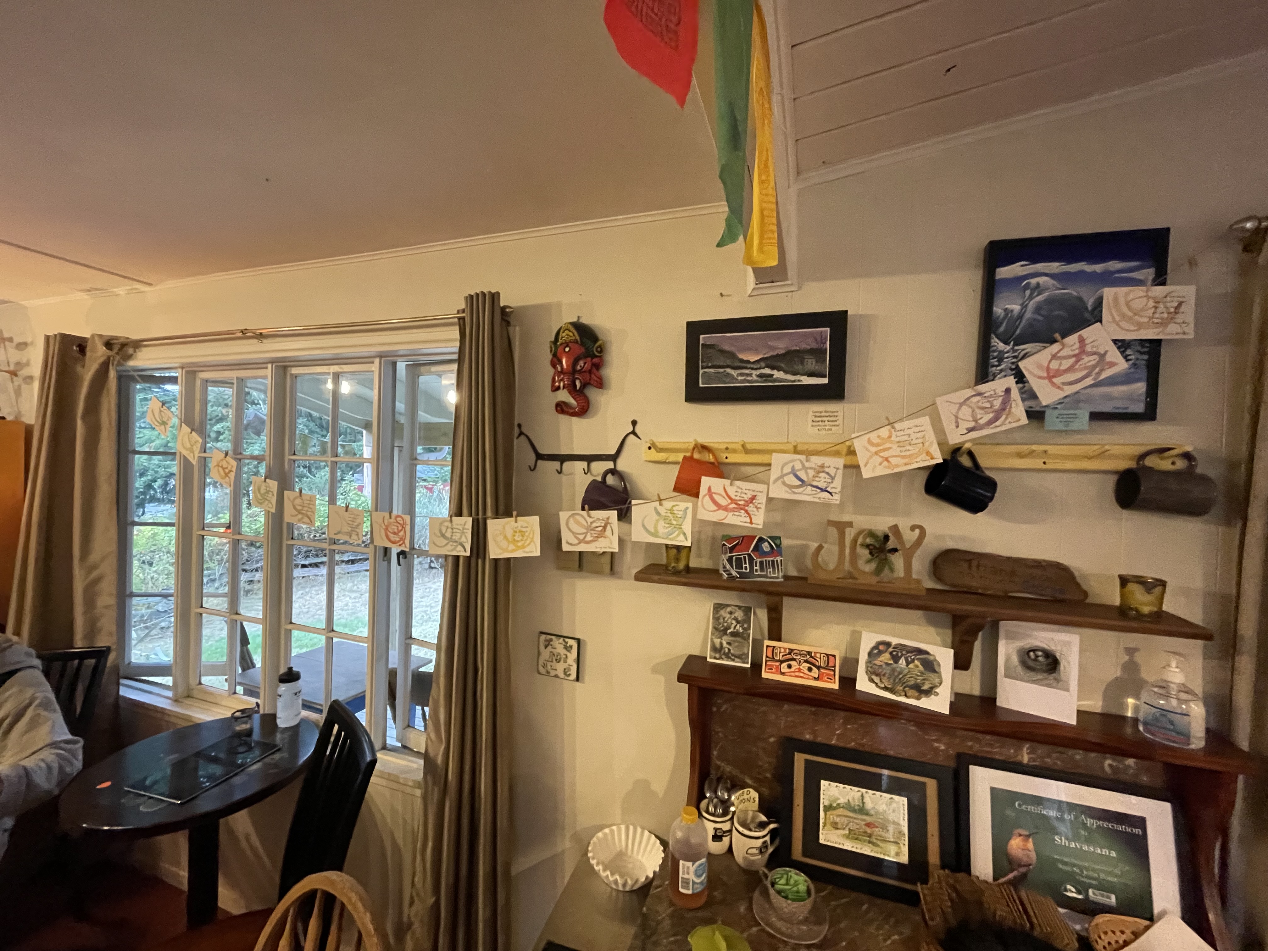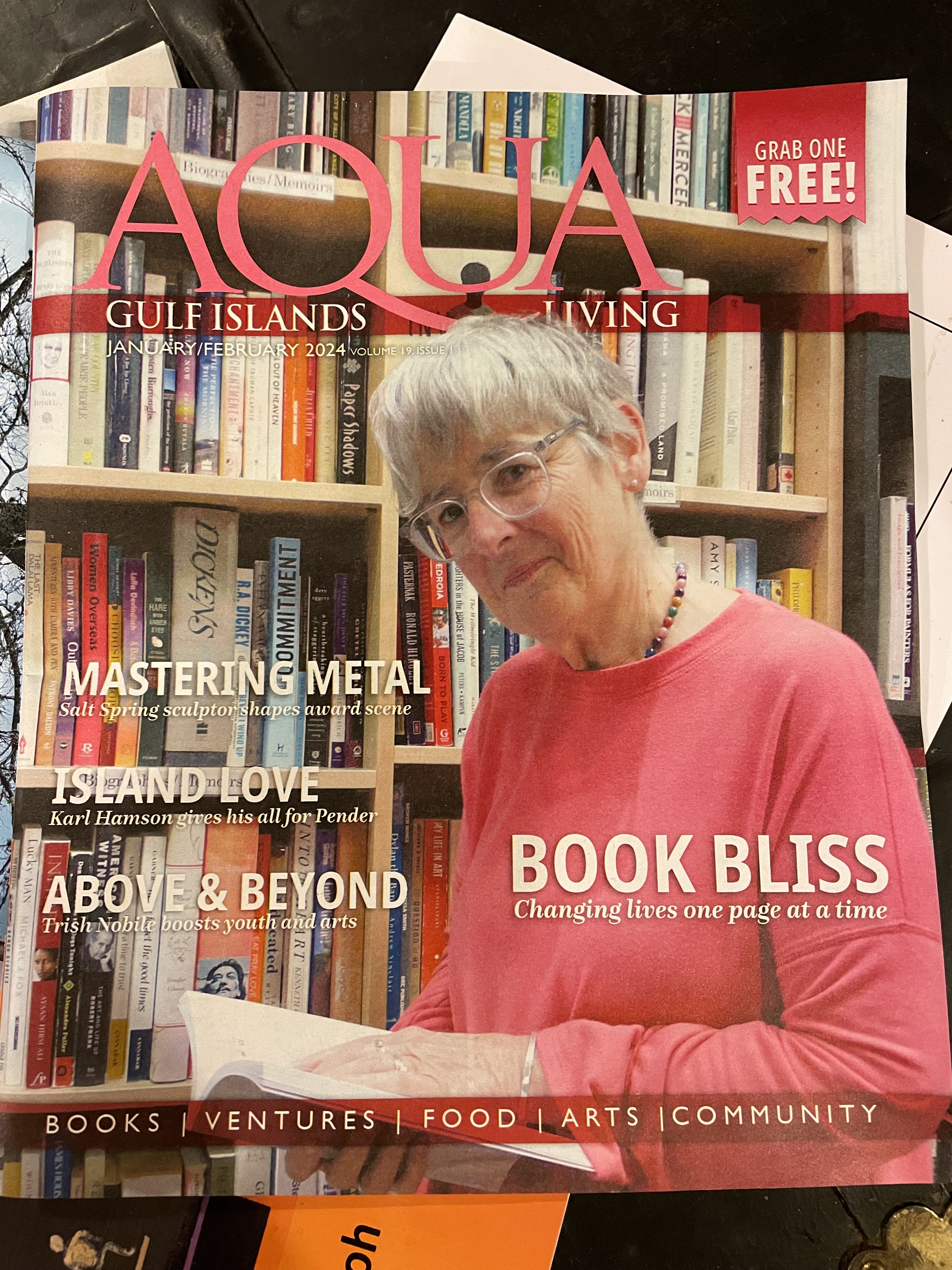 I am genuinely humbled by the kindness and generosity of my community – special thanks to Esnie & Joseph, Margaret & Andrea, Fil, Stephen & Joyce, Bill, Bob, Billie, Kathleen, Empty Sky & Jim, Gail, Katherine, Vicki & Harold, Allen & Kim, Keith & Alicia, Brenda, Dave & Kelly & Michael (and to those I have missed) for: Fruit of all kinds; decadent yummy treats from the market; salmon, venison, shrimp, corn, vegetables; Chicken Soup, bread & rice to tide me over while I had Covid; 3 books authored by Island Writers: Joseph Loh, Jeremy Borsos & John O’Brien; preserves – jams & chutneys; Bouquets galore; people who offer their assistance & time – babysitting Shavasana while I’m gone, fixing two lamps, constructive advice, car repairs…etc, etc; hand made cards – including a string of 17 very thoughtful, hand-made song-lyric cards, by Mary, to give away as mementos to guests; plus, arts & crafts, and – perhaps best of all – a set of knee pads from my landlord! (No, it’s not what you think – it’s to make gardening easier🤣)