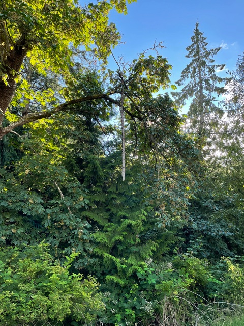 A widowmaker (or “Fool Killer” as Mr. Google also calls them🤣) is a term used to describe a broken branch that is suspended in the air and stuck on a part of another tree. I learned this term from my brief stint working for Macmillan Bloedel, in Port Hardy back in the 70’s. These branches can be extremely dangerous and can fall at any time posing a lethal threat to anyone who might be standing underneath. I became aware of the widowmaker, hanging off this maple tree, when I first arrived on the property 12 years prior, and always made a point of pointing it out to anyone using the trail or doing work in the vicinity.