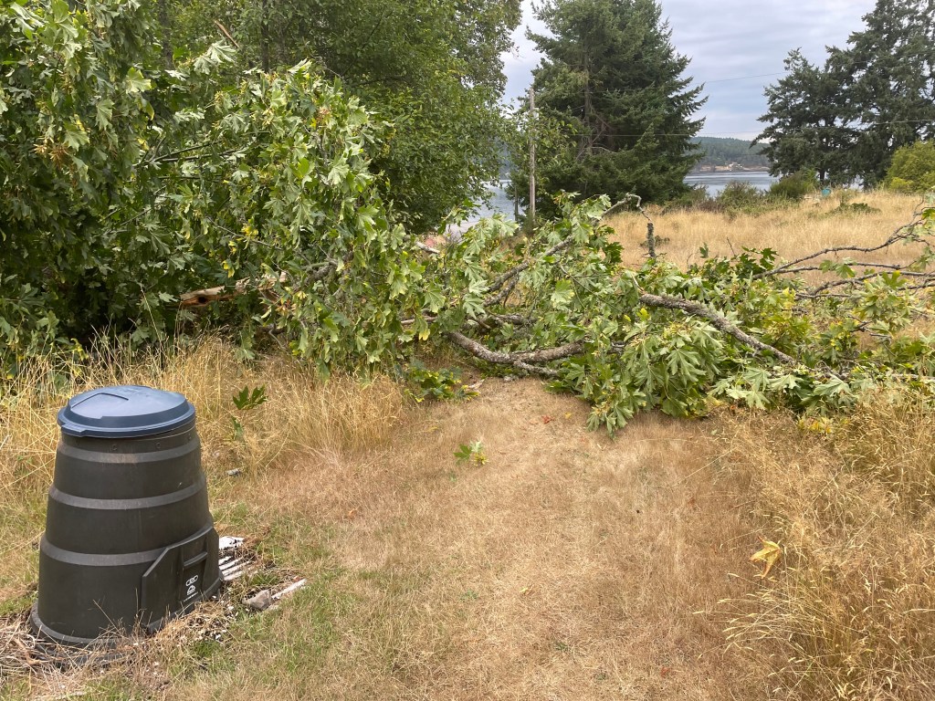 Turning now to the debris field and the mass of leaves, twigs, and branches which blocked our access to the lower part of the property, I thought, “Gee this is going to be a big cleanup, lots of time, toil and tools, I’d better call Dave.” We tenants of the property are lucky to have Dave & Eva as landlords, luckier still that they were both over on Mayne spending a little time on their 10-acre parcel of waterfront bliss. But managing a large chunk of land is not a walk in the park – so to speak – as there are always chores and work to be done. This new, unexpected problem was but one example.