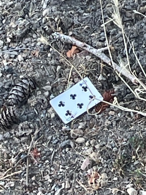 The year started with a White Deer which is seen by many cultures as a symbol of good luck or significant change. Many Indigenous groups see the white deer as sacred and a portent of good fortune. The Celts viewed them as messengers from the “other world.” I also tend to notice quite a few Heart Shapes in nature, and elsewhere – which I consider to be a good thing – and saw this leaf and root as further positive indicators along the way. This was followed by a “Queen of Hearts” card lying randomly on my path which can represent many things including love, passion, nurturing, power, strength, femininity and emotional intelligence – all very positive things, of course, unless you choose to associate the “Q of ❤️” with Disney’s Alice in Wonderland character who is a tyrannical figure with a short temper and a love for beheadings!….we must be very selective where we choose to attach meaning…and the “6 of Clubs”? this might be the “wild card” thrown in for perspective, as it can represent “responsibility, seriousness, and the struggle between a sense of duty and inertia, or a tendency to resist change”…this might be a card that Aunt Agatha tossed along the path to exhort me to action over lethargy.