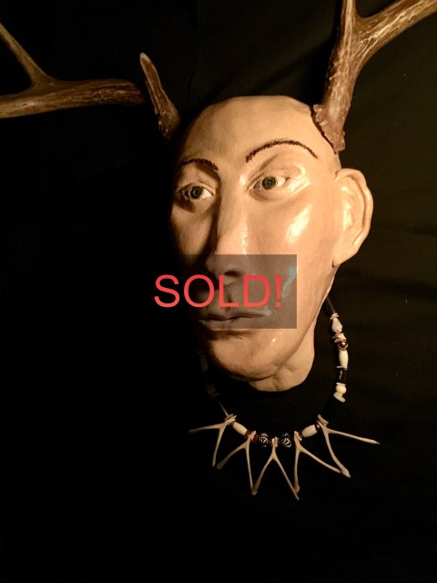 Ceramic human form imagery melded with antler and horn. …THESE MASKS ARE AVAILABLE FOR PURCHASE